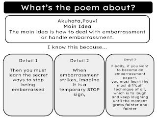 Today for writing we were reading an a embarrassment poem.The is book was about dealing embarrassment or handling it. We created a DLO with instructions about how to stop being embarrassed. 1st you must learn the secret to stop being embarrassed. 2nd When embarrassment strikes, imagine it is a temporary STOP sign. Finally if you want to become an embarrassment expert, you must learn the most difficult technique of all, which is to laugh and keep laughing until the moment grows fainter and fainter